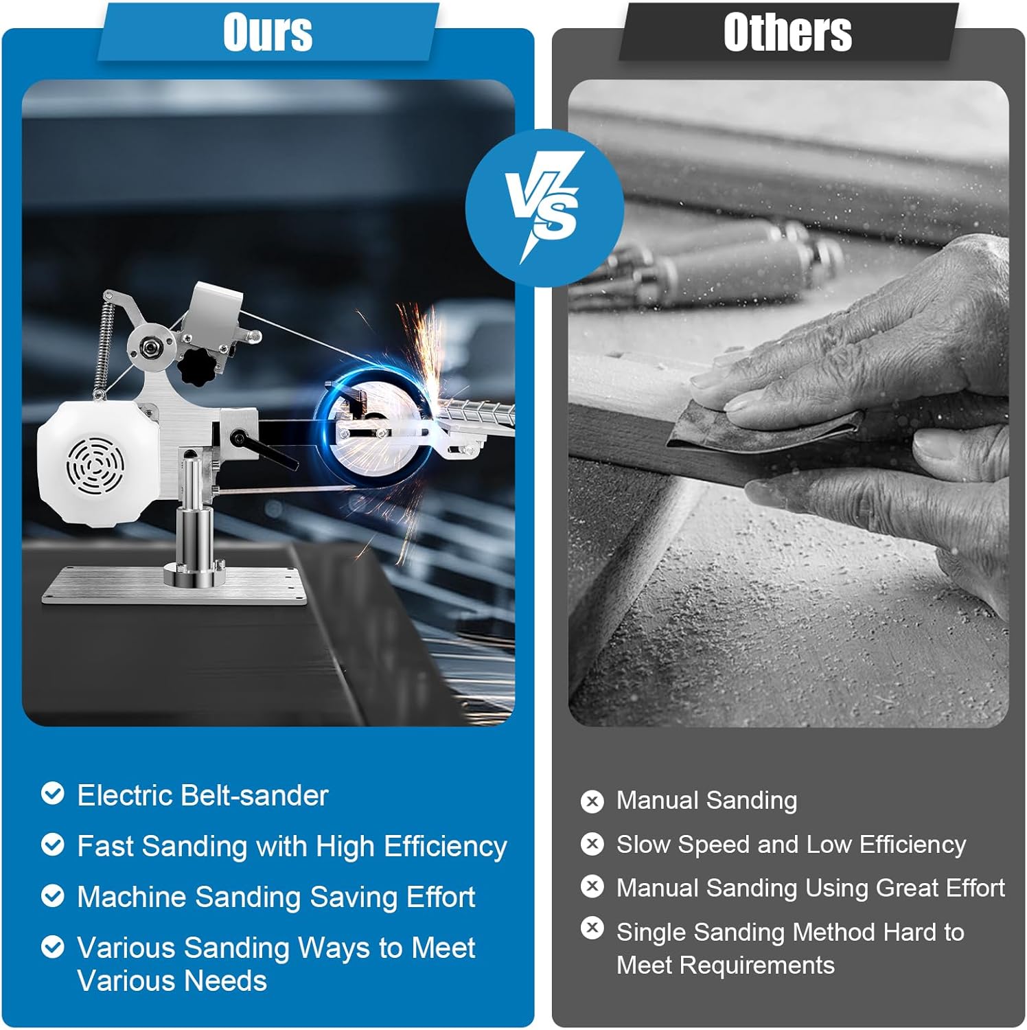 - [Sicuro da usare]: è progettato con fori di dissipazione del calore, che possono dissipare tempestivamente il calore per proteggere il motore. Il suo deflettore protettivo può evitare che la cintura abrasiva si rompa e ferisca le persone, oltre a impedire alle scintille di abbagliare gli occhi. In questo modo puoi usarlo con maggiore sicurezza.